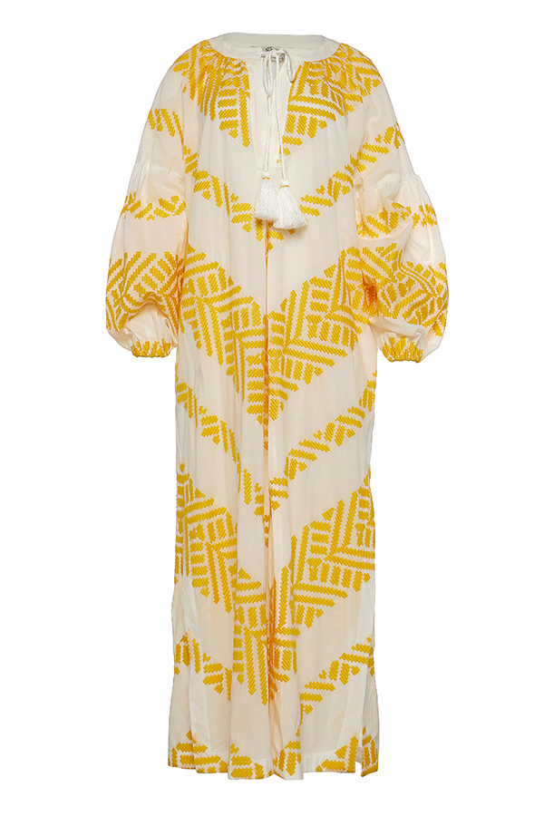 The Embroidered Ecru Yellow Kaftan Dress by Devotion Twins is a truly exquisite and limited edition piece that effortlessly blends timeless design with artisanal craftsmanship. This kaftan dress is a testament to Devotion Twins' commitment to creating unique and high-quality fashion items.