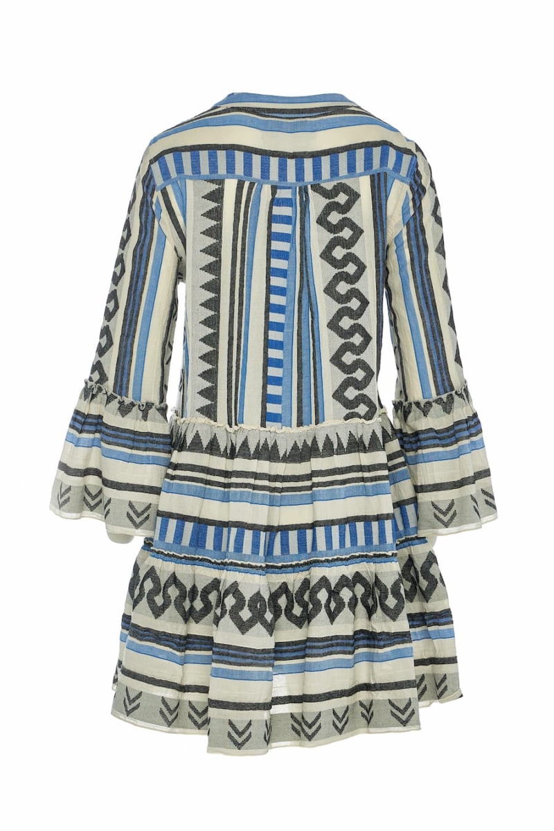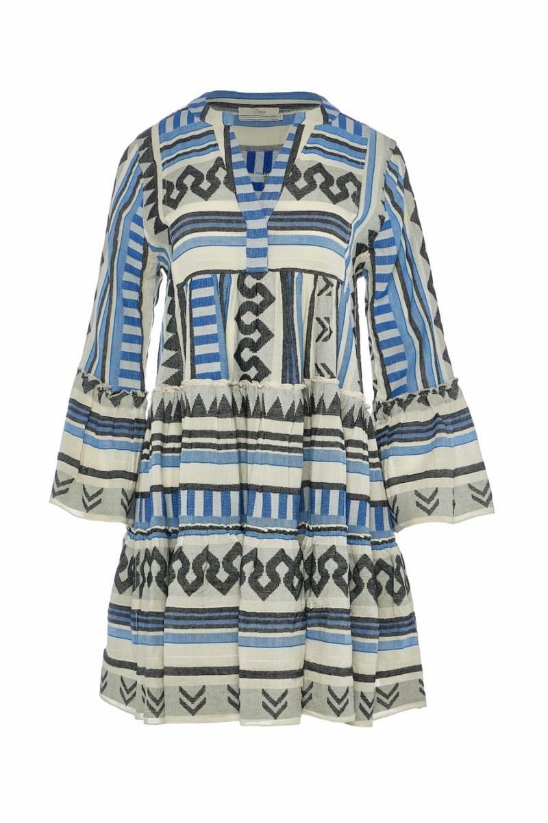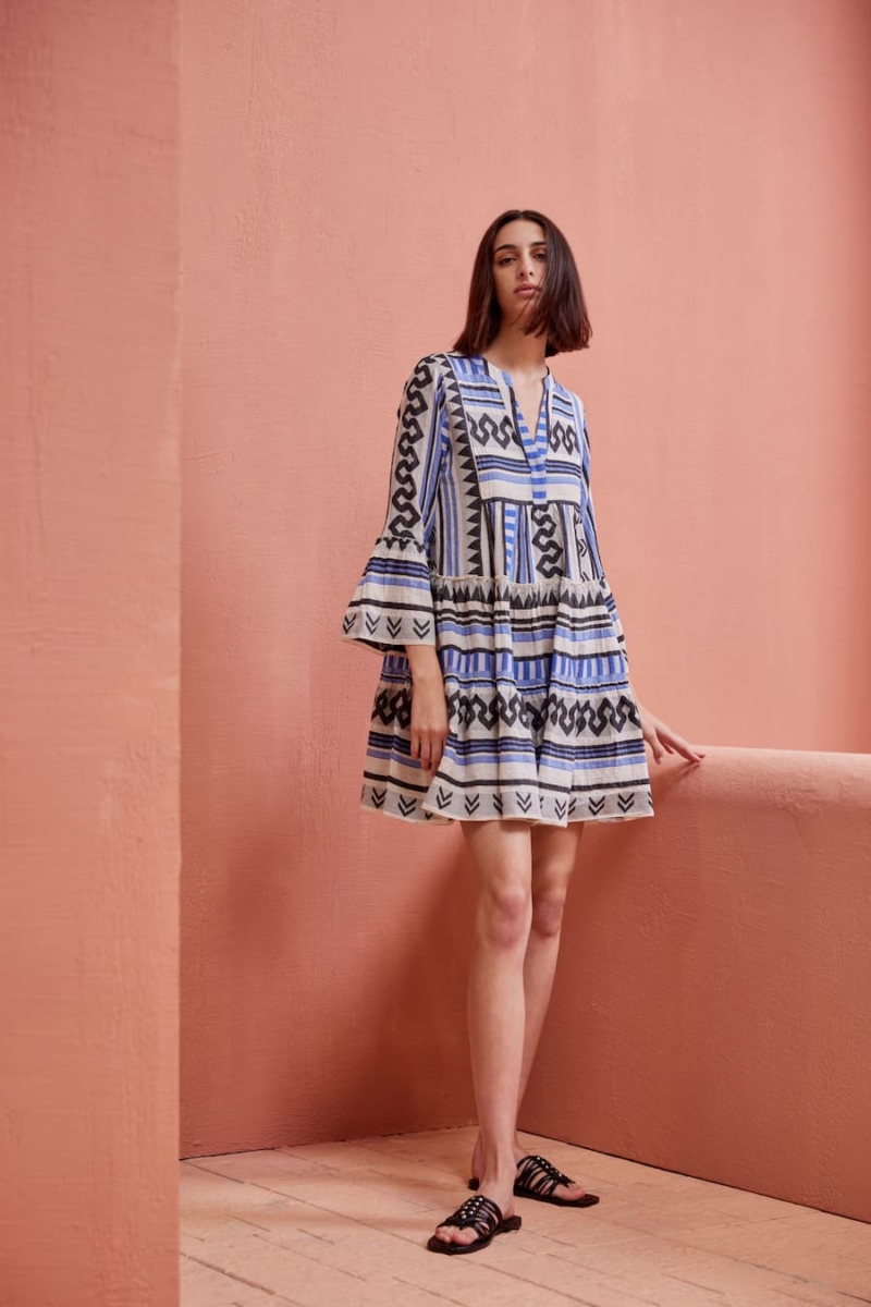 Devotion twins Ella Dress Blue Black Short Step into a Grecian summer with the Ella Dress by Devotion Twins!  Crafted with the breezy, sun-kissed vibes of the Mediterranean, this dress is a testament to timeless style and comfort. Made with love in Greece, it features a playful and bold geometric print that captures the eye and soul. With its relaxed fit and flowy bell sleeves, it’s perfect for the woman who adores a mix of casual elegance and bohemian flair. The tunic-style neckline adds a touch of sophistication, making it versatile for a seaside stroll or a chic city outing. Embrace the essence of Greek artisanal fashion and add a jet-setter edge to your wardrobe!