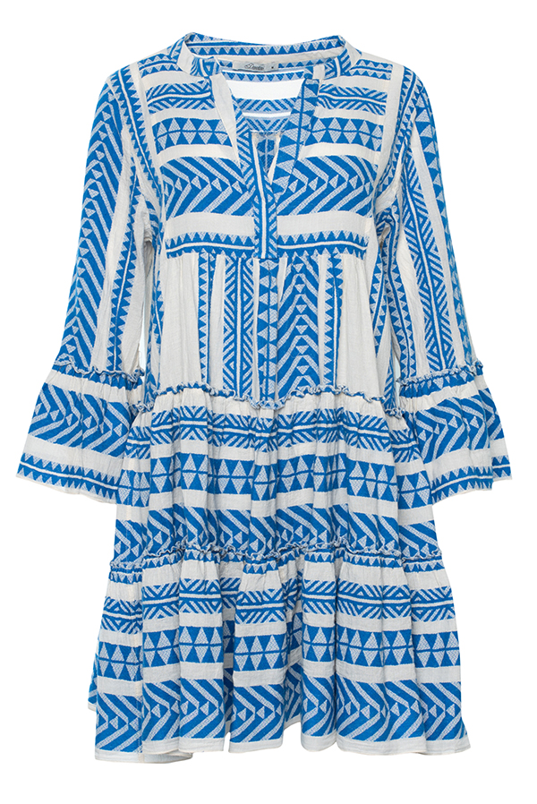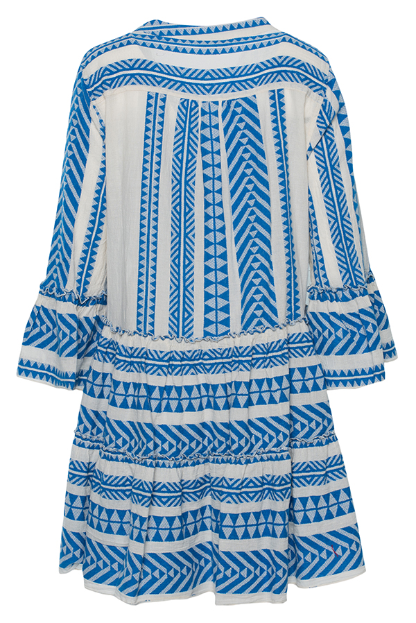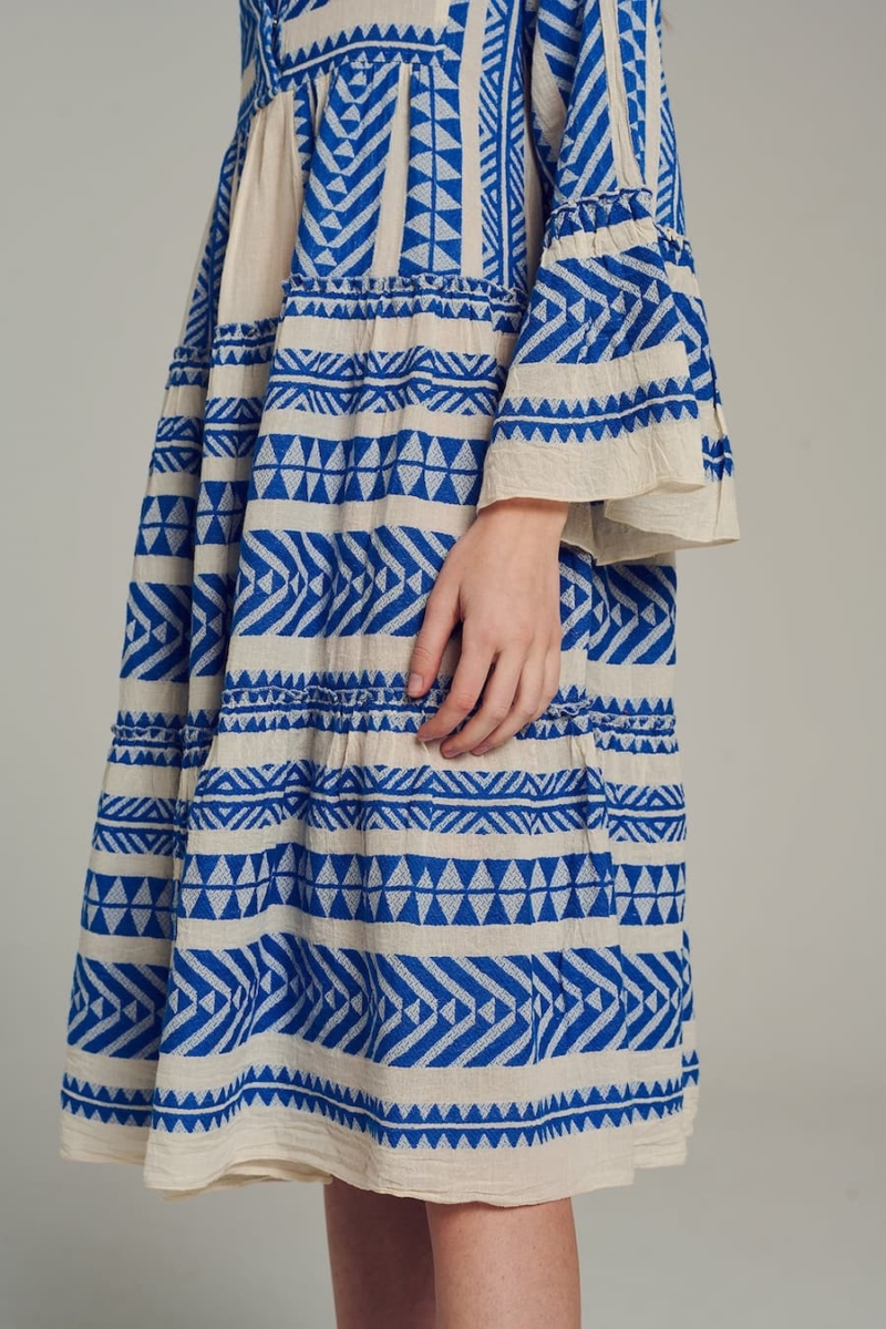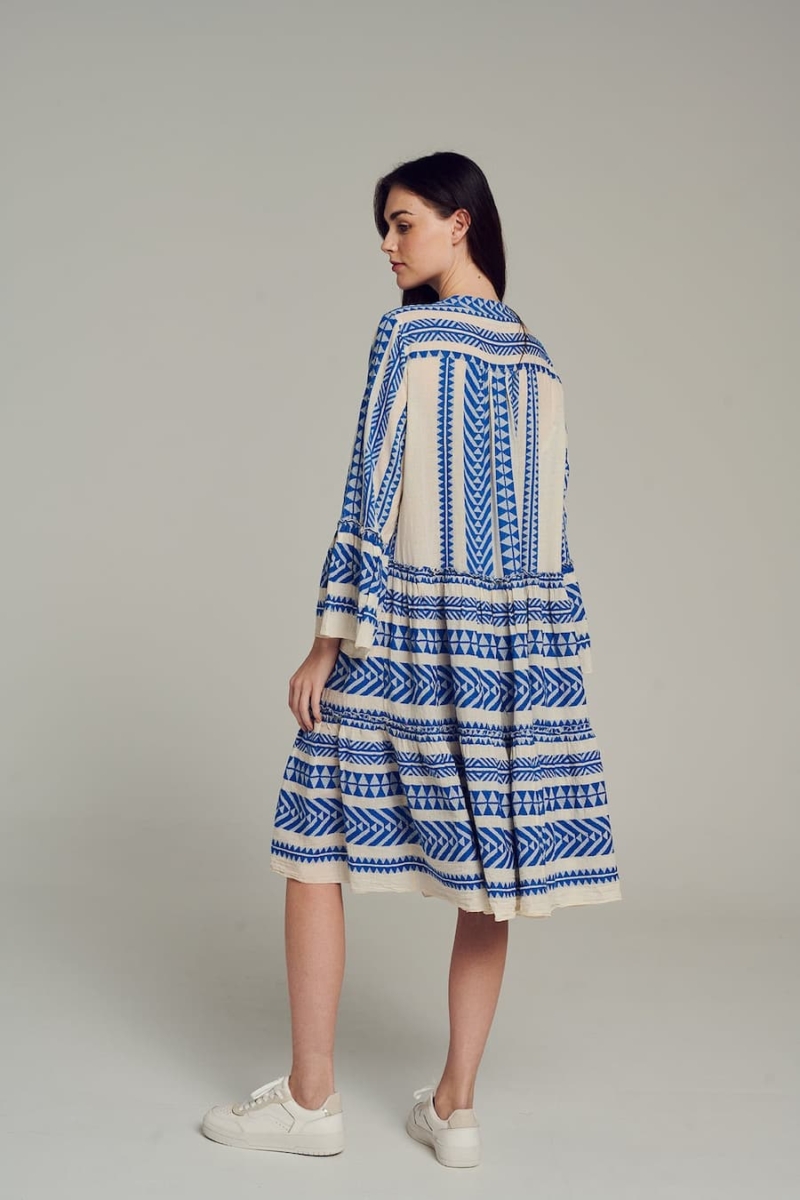 The Ella Dress in blue by Devotion Twins is a staple of Greek bohemian style, combining comfort and elegance effortlessly. Made in Greece with premium-quality cotton, this dress features a flattering midi length, a relaxed fit, and an intricate geometric pattern inspired by Greek heritage. The voluminous bell sleeves and tiered skirt add a feminine touch, making it ideal for casual summer outings, seaside vacations, or chic evening events. Embrace sustainable fashion with this timeless piece designed to celebrate individuality and artistry