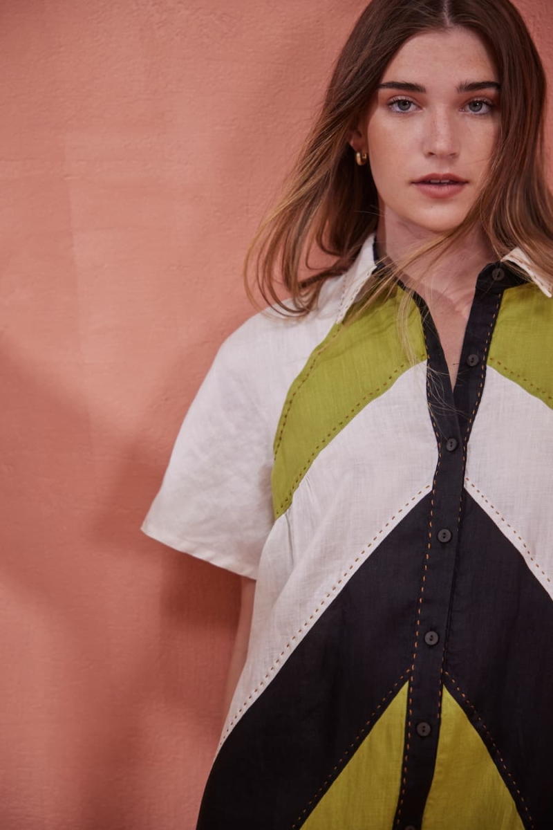 Devotion Twins Linen short dress Solana by Devotion Twins is a striking piece characterized by its bold geometric design and color-blocking. It showcases a playful yet sophisticated use of asymmetry with a diagonal division that contrasts sharply between olive green, off-white, and black panels. This knee-length dress features a shirt-like collar and a button-down front, which gives it a relaxed and versatile vibe, suitable for both casual outings and more styled occasions.