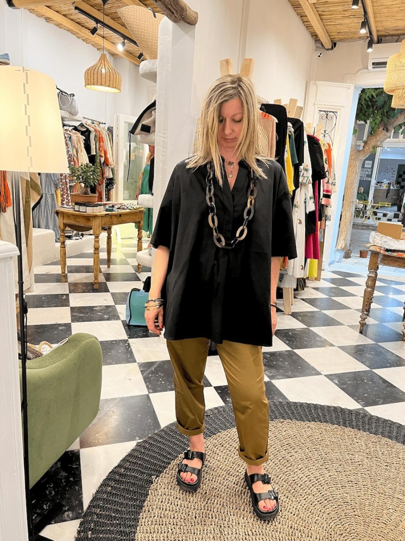 Stella's blouse is available in classic colors: black white and camel. These color options provide versatility and make it easy to pair with various bottoms, such as jeans, skirts, or trousers, allowing for a range of stylish outfit choices.