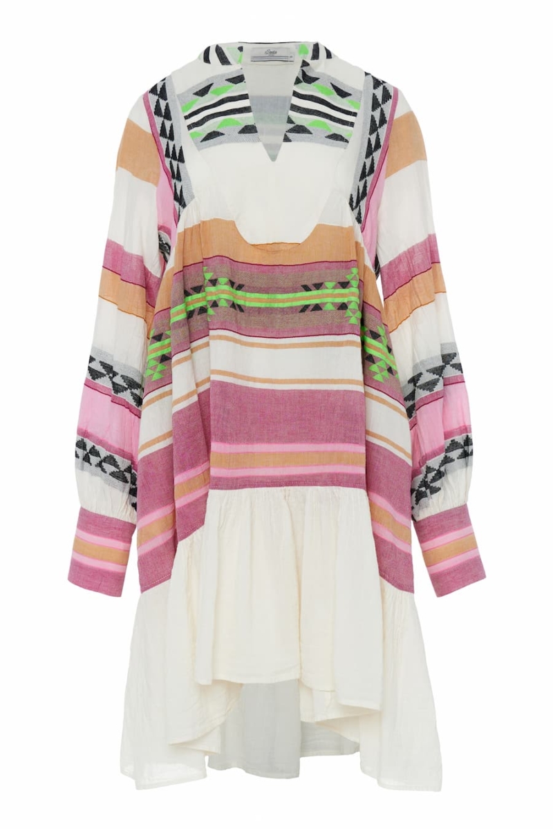 Crafted from breezy, lightweight fabric, this dress offers a comfortable yet flattering fit, perfect for those balmy summer days. Its distinctive pattern, featuring vibrant stripes and geometric accents, paints a picture of the colorful streets of samos island