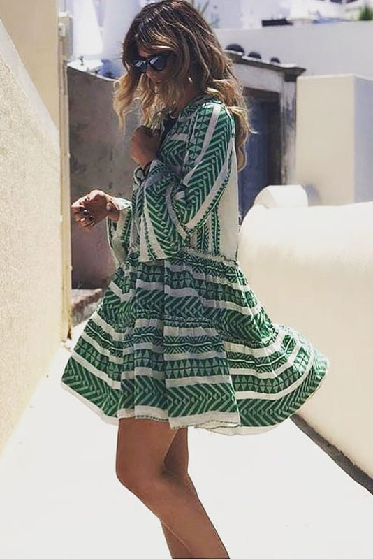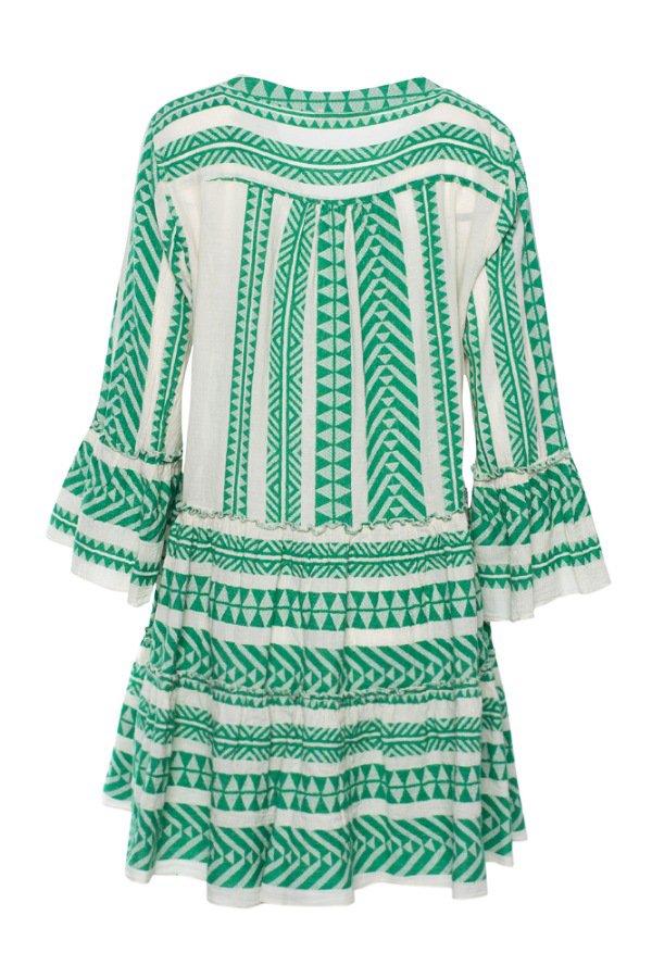 The Signature Ella Dress by Devotion Twins in the classic green and ecru colorway is a beautifully designed, boho-inspired piece. This dress features a bold geometric pattern with triangles and lines, creating a striking visual appeal. Its relaxed, tiered silhouette gives it a comfortable, flowy fit, while the long sleeves with flared cuffs add an elegant touch. The dress has a flattering V-neckline with a button closure, making it perfect for both casual and semi-formal occasions. Crafted with attention to detail, it combines style, comfort, and versatility, making it a timeless addition to any wardrobe.