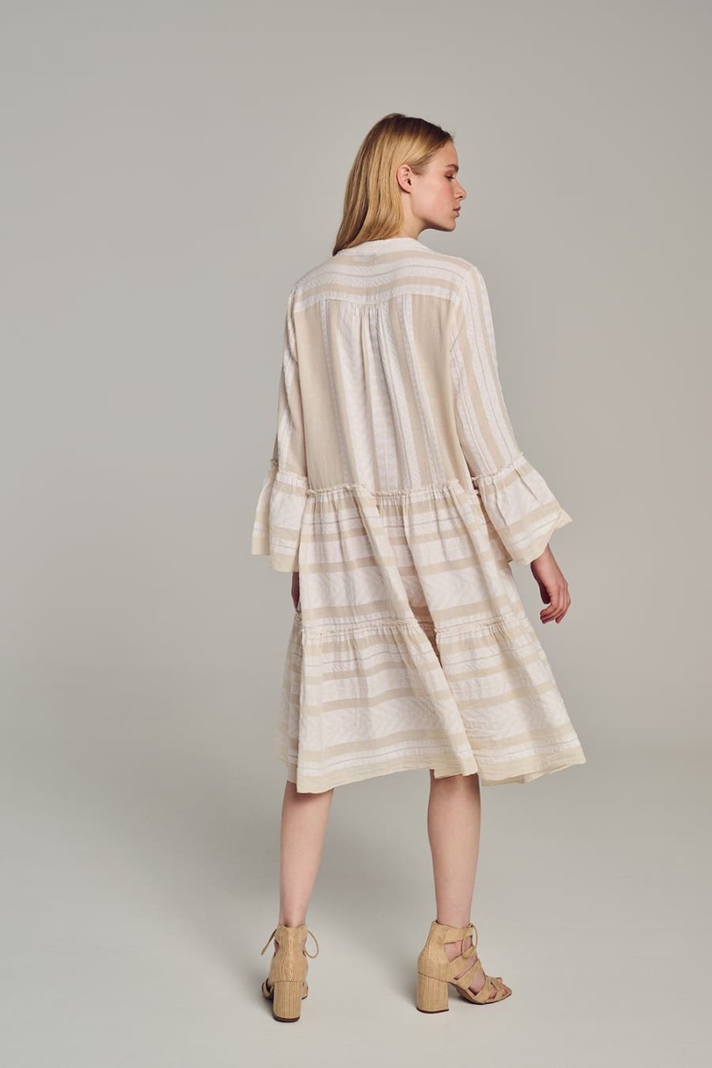 The dress falls to a flattering midi length, with a hemline that typically hits just below the knee or mid-calf, measuring approximately 102 cm. This length is both elegant and practical, making it suitable for various occasions. The dress comes in a lovely beige color, which is known for its timeless and neutral appeal. Beige is a versatile hue that can be easily accessorized and styled to suit your personal taste and the season.