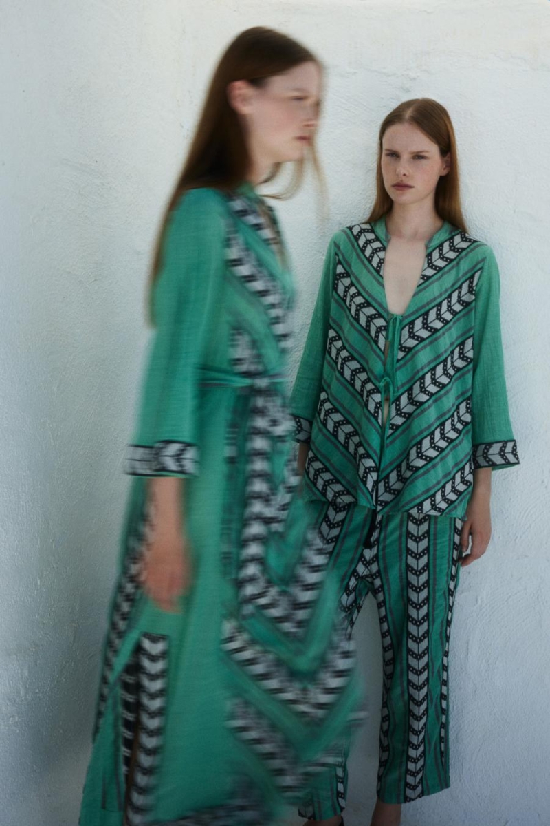 The Gorgeous Jacquard Shirt by Devotion Twins is a statement piece that combines traditional Greek craftsmanship with modern bohemian elegance. Handmade in Greece, this lightweight and breathable shirt features exquisite black embroidery on a vibrant green semi-sheer fabric, offering a perfect blend of style and comfort.