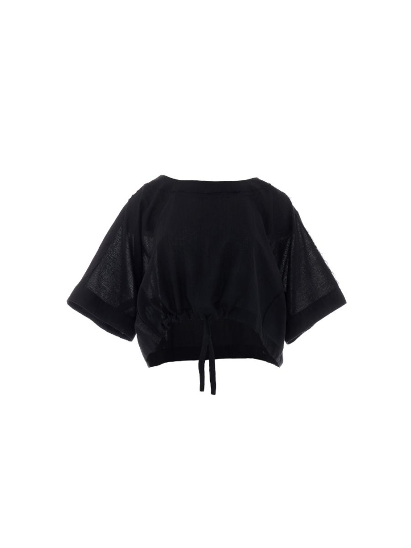 The Kaliopi gauze top by Devotion Twins is a lightweight and breathable piece crafted from premium-quality fabric. Featuring a relaxed fit with a drawstring hem, this elegant black top is perfect for effortless summer styling.