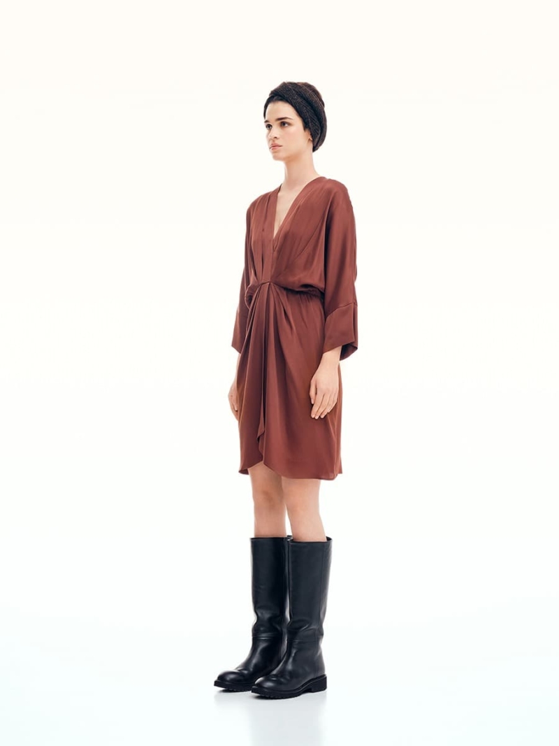 Kimono style dress made of 100% silky viscose. It has a flattering “V” neckline and a front slit that adds a playfulness to the look. It has side pockets and closes with a concealed zip on the side while its kimono style as well as the dainty shine of the material make it perfect for cocktail outfits.