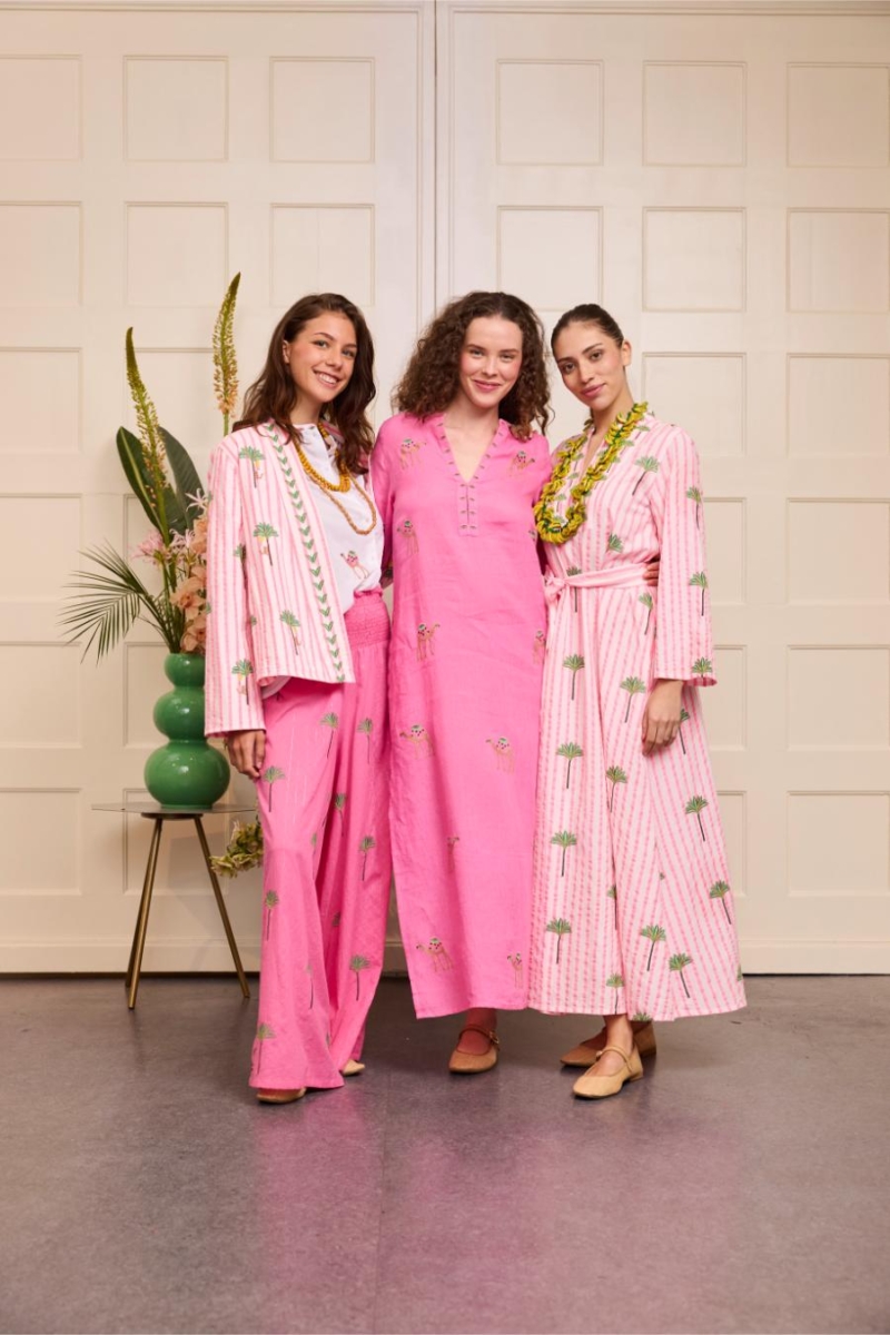 Nimo With Love Lemon Dress in pink stripes with palm embroidery, cotton maxi, belted kaftan, perfect for resort wear, summer vacation, beach style