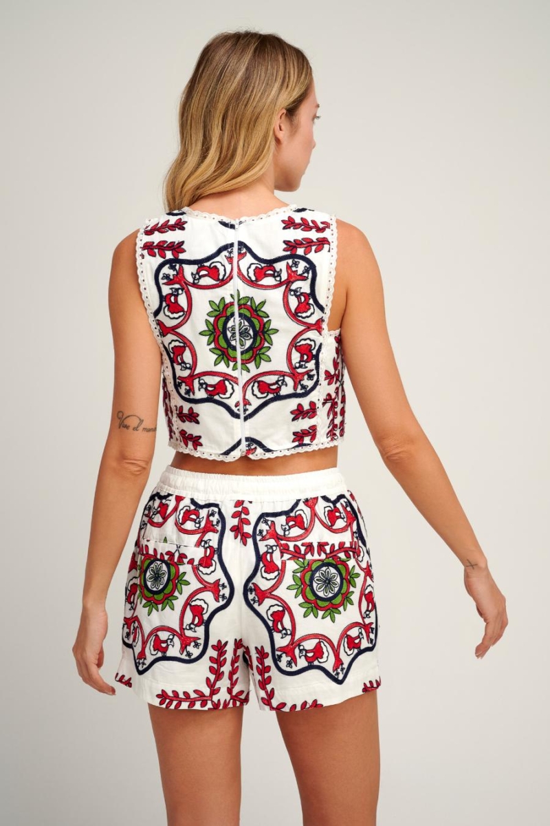 Elevate your summer wardrobe with these embroidered high-waisted shorts crafted from lightweight, breathable cotton. Featuring a vibrant folk-inspired pattern in red, green, navy, and black, the design offers a standout look with exceptional comfort. The elastic waistband with drawstring ensures a flattering fit, while the intricate embroidery adds an artisanal touch, perfect for beach getaways, brunch dates, or casual city strolls.