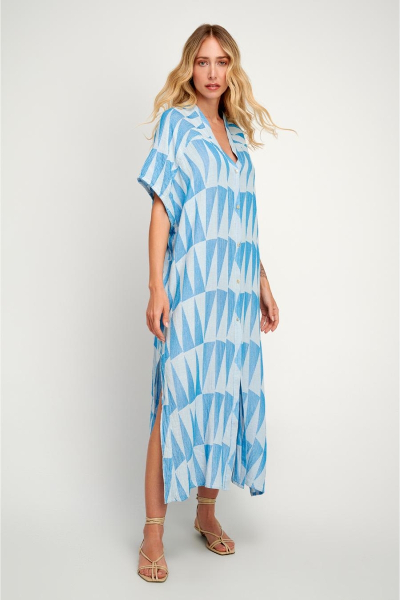 one size the Pearl & Caviar One-Size Kaftan Dress (S25P1045), available in blue and green. Designed for effortless elegance, this lightweight kaftan features a relaxed fit, geometric patterns, and a button-down front. With side slits for added movement and breathability, it's perfect for beach outings, resort wear, or casual chic looks. Crafted with high-quality fabric, this kaftan ensures comfort and style in every step.
