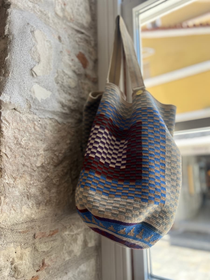 Handcrafted crochet shoulder bag with intricate checkered and geometric patterns in beige, blue, red, and burgundy tones. Ethically made, lightweight and spacious—perfect for summer outings or everyday use.