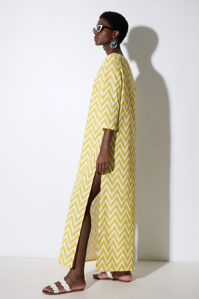 Make a bold statement this summer in the Yiorgos Koulasidis GinFizz Yellow Kaftan Dress. Featuring a vibrant chevron print, airy silhouette, and Greek-inspired elegance — perfect for sun-drenched escapes.